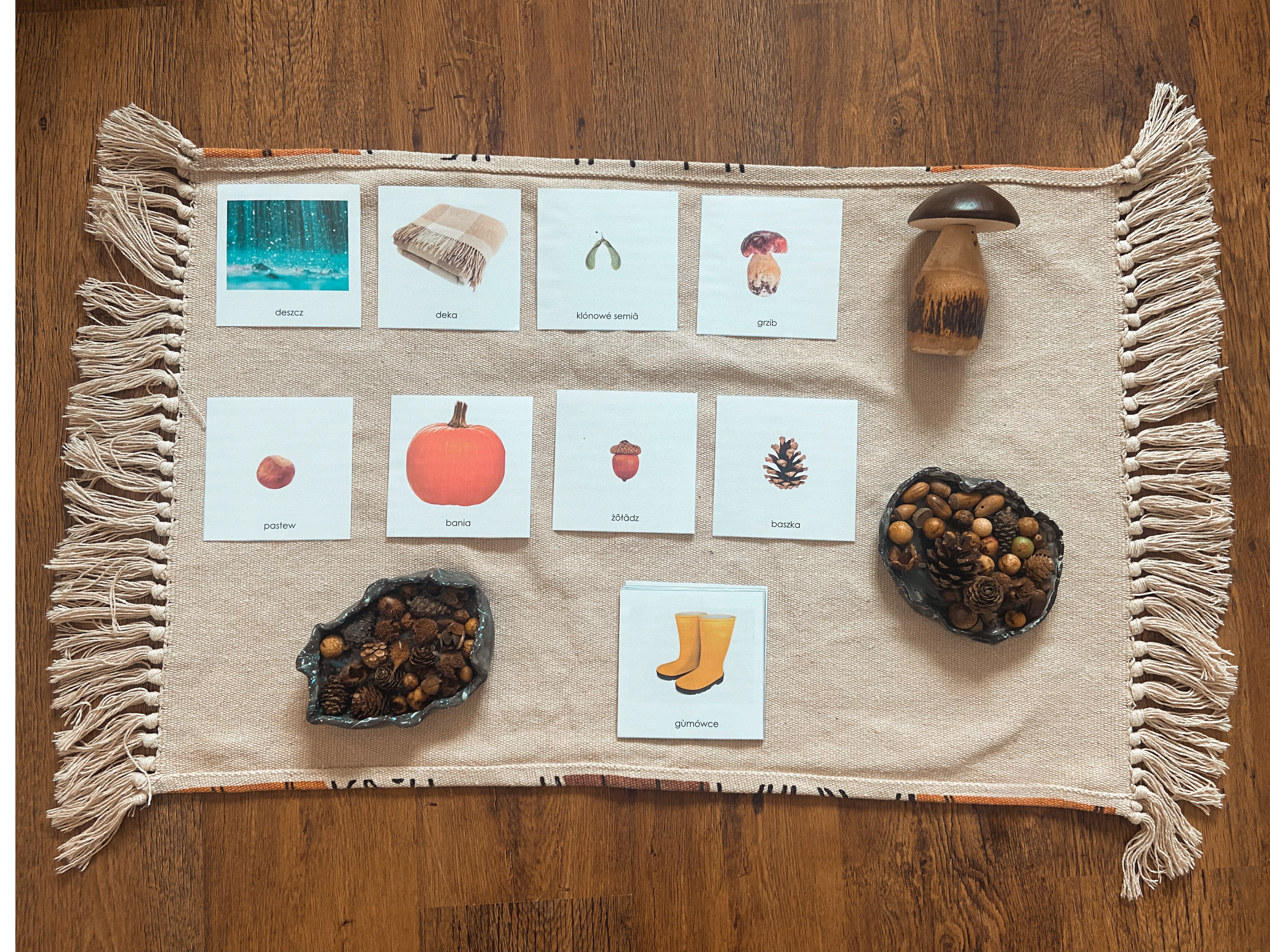 Karty Montessori wzbogacające słownictwo to wyjątkowe pomoce dydaktyczne ułatwiające przyswajanie słownictwa w języku kaszubskim.